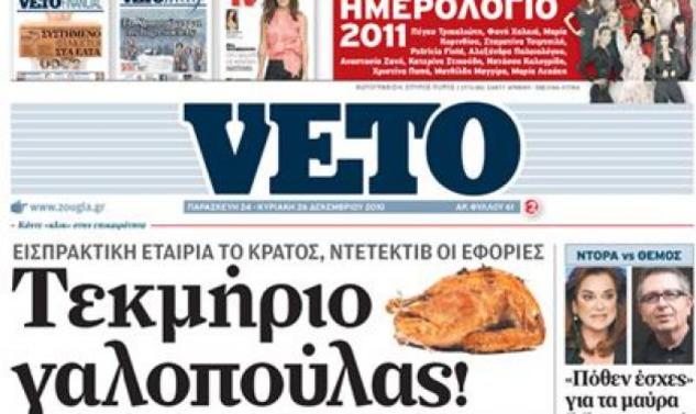 “Αυτή η φάση του ταξιδιού τελείωσε. Η εφημερίδα “VETO” διακόπτει την έκδοση της. Η συνέχιση μιας εκδοτικής και δημοσιογραφικής προσπάθειας με τους δικούς μας όρους κατέστη πλέον οικονομικά ανέφικτη. Σε καιρούς δομικής και συνάμα βαθειάς οικονομικής κρίσης του Τύπου και των ΜΜΕ, δεν θα μπορούσαμε να συνεχίσουμε την έκδοση της εφημερίδας χωρίς να παραβούμε τους κανόνες που εμείς θεσπίσαμε. Πλήρης οικονομική και δημοσιογραφική ανεξαρτησία, καμία εξάρτηση από οικονομικά ή πολιτικά συμφέροντα. Κανόνες που ηχούν ως αυτονόητοι αλλά που στο εκδοτικό περιβάλλον αυτού του τόπου δεν είναι.
